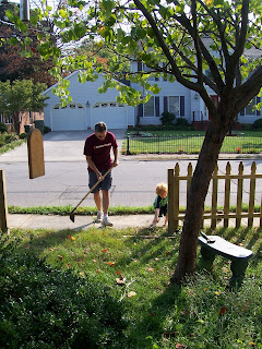 It is amazing to me how much cozier it makes the yard though, how much more inviting this little patch of grass has suddenly become. Saturday night the four of us hung out until bath-time out there. It was fantastic! We were able to toss the ball back and forth without worrying about it going into the road; Tristan was able to crawl around without the constant need to try and get him to quit trying to crawl out to the road (Why does he always want to do that? Is he trying to get away or something?); it was just fun & relaxing. Of course, it didn't hurt that it had been a gorgeous day!